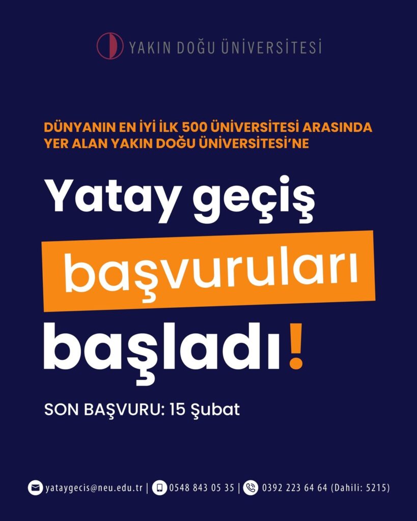 Yakın Doğu Üniversitesi’ne yatay geçiş yapmak isteyen öğrencilerin 15 Şubat tarihine kadar başvuru yapmaları gerekiyor. Yatay geçiş başvuru koşulları ile özel burs imkanları hakkında detaylı bilgiye [email protected] adresinden veya 0548 843 05 35 ile +90 392 223 64 64 no’lu (dahili 5215) telefonlarından ulaşmak mümkün.